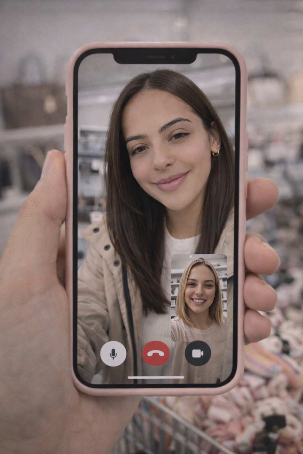Você escolhe seus produtos por videochamada, acompanha tudo ao vivo, tira dúvidas na hora e decide com calma. É ideal para quem busca peças específicas, tamanhos certos, oportunidades de outlet e cupons que muitas vezes não existem no online.